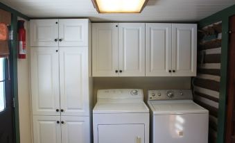 The two bedroom main cabin sleeps 5 and features a master bedroom with queen bed and second bedroom with twin-over-full bunk bed. Fully equipped kitchen includes all dishware and cooking ware. Cozy living room with comfy leather chairs and wood burning fireplace. Full size washer and dryer inside of the cabin.