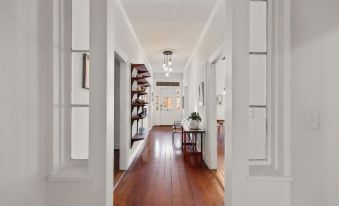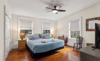 This lovely historic home boast 2 full bathrooms. The primary en-suite bathroom is nicely updated with a luxurious double shower and soaker tub. The other full bathroom includes a shower + tub combination, which is particularly convenient for families with small children. Enjoy steady hot water and great water pressure. Bath towels, shampoo, conditioner, body wash, hand soap, and body lotion are provided.