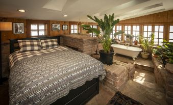 Adjacent to the Main Cabin is the historic Tolstoy Cabin with a queen bed. Close by is the Water House with a full bed, a spa-like shower, and claw foot tub, laundry, and bathroom. Next door, is the Love Shack with a queen bed. A short walk away is the Bunkhouse with a queen bed, three twins, a full kitchen, and bathroom. Down by the creek is the Sauna Cabin with a full bed, a unique wood-burning sauna, wrap around decks and the famed cold plunge pond.