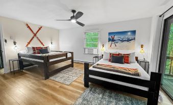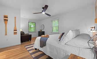 這間 1,850 平方英尺的房屋最多可容納 8 位顧客。三間臥室均鋪有豪華乙烯基地板,配有舒適的床(提供床單),並享有自然美景。主臥套房配有一張特大床,配有記憶海綿床墊和柔軟的枕頭。這間客房裝飾有湖泊風格的藝術品,並配有平板電視。衣櫃裡還藏有供小顧客使用的嬰兒遊戲包。這間客房設有獨立衛浴(詳情見下文)。