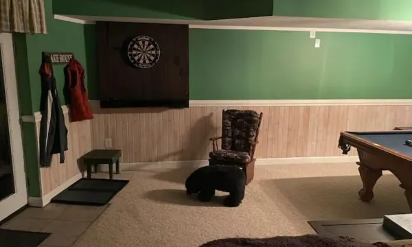A pet-friendly retreat with a 6-person hot tub overlooking the lake. Unwind in this expansive 5-bedroom, 3-story chalet, for up to 13 guests (ideal for families). The main floor boasts a spacious dining area, family room, 2nd master bedroom. Explore the basement's vintage bar and game room with a pool table, darts, and more or enjoy quality time playing games provided throughout the house. Indulge in movie nights on the 70" TV or fireside patio time with views. Your unforgettable getaway awaits!