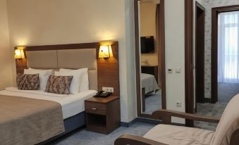 1. Начну с минусов! Не люблю когда обманывают за свои же деньги. Забронировали номер с балконом на официальном сайте отеля с 4.07.23- 6.07.23 предварительно им позвонив и уточнив перед оплатой, есть ли он в наличии. Оплатили 16500 за две ночи с 10% скидкой, которая была указана. Для нас важно было балкон! Так как мы были с 10 месячным ребенком, который в 20:00 уже спит и нужна тишина, а на балконе мы с мужем могли общаться. Но по приезду, а приехали мы в 15:00 нам на ресепшен сообщили что номера такого нет, и глупой отговоркой что его перед нами жильцы разгромили. И вот остался только без балкона. На что я сказала что так не делается и надо было нам позвонить и сказать и мы бы забронировали другой отель. Времени не было с ними ругаться и искать другой отель, тк ребёнка нужно было положить спать. Принесли извинения и принесли нам бутылку шампанского и фрукты со « шведского стола». Но факт остается фактом и номер нам не поменяли. 2. Человек администратор с перагидрольной прической, с пропитым лицом и переколотым ботоксом филлерами и всем чем возможно, хамка высокомерная. Видно что ее место в таких гостишках. Такие как « мрия» ей не известны. Что с клиентами надо вести себя с попроще лицом, пусть даже и немножко алковитым. 3. Шведский стол: это смех) из шведского печенье, и яблоки с киви причем два дня подряд, без изменения. Кофемашина есть, но кофе не вкусный, самый дешевый. В меню указаны завтраки со смешными названиями «европейский» и тд. Лично для меня было такого завтрака мало, что говорить о муже. Два бутерброда с невидимым кусочком семги 🤷🏼♀️ чтобы не объелись. Повар доброжелательна и с приятной энергетикой, это наверно единственный сотрудник который порадовал. 4. Из плюсов: матрас удобный. Шторы Блэк аут. Море рядом. Бассейн есть. Номер чистый, есть халаты. Хорошие стеклопакеты, не слышно с улицы ничего вообще. 5. Машину мы оставляли на платной парковке 50 метров. 700 р сутки.