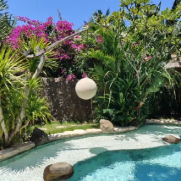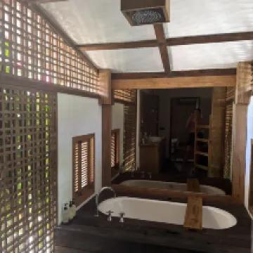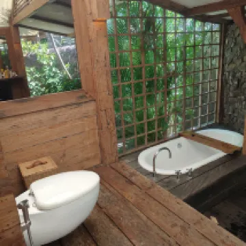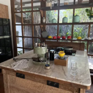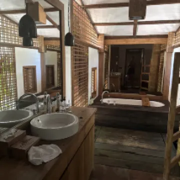 Это был прекрасный опыт. Мы остались довольны и сервисом, и состоянием виллы. Все сделано в эко стиле и очень эргономично. Можно общаться через ватсап и запрашивать информацию, отвечают очень оперативно, а также завтрак по меню. Цена в мини баре дешевле, чем в ближайших магазинах. Все кухонные принадлежности есть, можно готовить, есть даже масло и соль с перцем. Кофемашину пополняют ежедневно, сварить кофе можно в любой момент. Зона отдыха чудесно оформлена, много зелени, пруд с рыбками и прекрасный освежающий бассейн. В каждом номере есть сейф, зубные щетки, фен, шампунь, крем для тела и спрей. Также стоят спреи от Комаров и на общем пати есть спираль от Комаров.