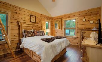 This luxury open concept 2 bed 2 bath cabin sleeps up to 8 people. Our sleeping arrangements are as follows: