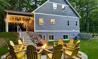 My favorite part of this house is the large covered patio which can seat 16 people. A large outdoor ceiling fan will keep you cool and the roof will keep you dry! Patio lights will be strung to create a great ambiance. Off the patio to the right will be a large Weber grill and off the patio to the left will be stairs to the fire pit. The best of MI summer evenings are spent around a fire pit.