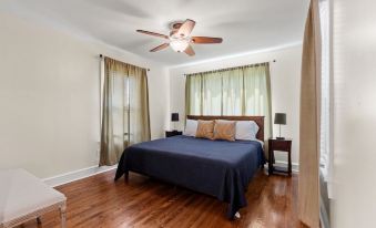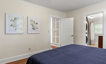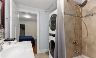 The second Master bedroom features a King bed, nightstands and reading lamps, a closet, and an en suite bathroom with a single vanity, traditional tub/shower combination, toilet, and our brand-new washer and dryer.