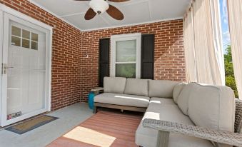 Our unique brick home features a large cozy front porch with a sectional sofa, a fenced in backyard with a gas fire pit, and a backyard "tiny house" that functions as a private office for two.