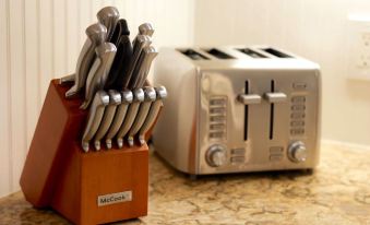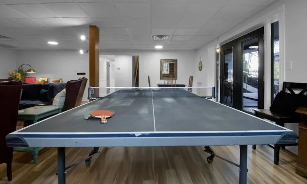 Onsite washer & dryer, spacious kitchen stocked with spices, olive oil, salt/pepper, Ninja blender, garbage bags, ziplocks, foil, chip clips, tea, sugar, toilet paper, paper towels. Three large TVs. The main level has 4 of the bedrooms all on one level. One office space in main level master bedroom. Walkout basement has large open space, bedroom with 2 queen beds, and a full bath and a 2nd desk space in the downstairs living room. Large patio space with fire pit, outdoor tables, grill, and corn hole. Great outdoor spaces on the front and back for reading a book or enjoying conversations.