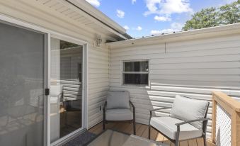 The front deck features two chairs for guests to enjoy a morning cup of coffee.
