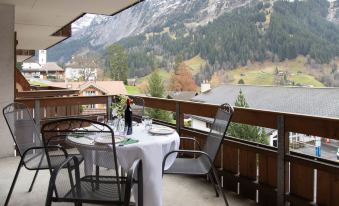 Residence "Chalet Abendrot apARTments". In the centre. In the house: reception, lounge, WiFi, table tennis, billiard table, playroom, lift, storage room for skis, central heating system. Pre-arrival grocery service. In Winter: please take snow chains. Communal covered parking (extra), public parking 200 m extra. Shop 400 m, restaurant 10 m, bus stop "Firstbahn" 80 m, railway station "Grindelwald Dorf" 800 m, outdoor swimming pool 2.5 km, indoor swimming pool 600 m. Golf course (9 hole) 2 km, tennis 1 km, minigolf 400 m, sports centre 600 m, mountain railway 800 m, gondola lift 80 m, ski rental 50 m, ski bus stop 80 m, cross country ski track 1 km, children's playground 600 m. Well-known lakes can easily be reached: Thuner-/Brienzersee 18 km. Please note: The owner does not accept any groups. Ski bus (free of charge). Neighbourhood highly sensitive to noise. Quietness and good behaviour expected. Indian restaurant "Golden India" in the house. The apartment house, built in chalet style, offers a youth room, a children's playroom, a garage (parking space CHF 98.00/week, reservation on arrival). Modern-rustic and cozy apartments, most with a spacious balcony or terrace and a wonderful view of the mountains. Please note: limited number of garage spaces. Pre-reservation not possible. Garage height and width: 12 parking spaces 2.09x2.06 m, 15 parking spaces 1.65x2.06 m. Max. 2000 kg. 3-room apartment 57 m2 on 2nd floor, south facing position. Living/dining room with cable TV (flat screen). 2 double bedrooms. Open kitchen (oven, dishwasher, 4 ceramic glass hob hotplates, toaster, kettle, electric coffee machine). Bath/WC. Balcony, south facing position. Terrace furniture. Beautiful view of the mountains and Eiger. Facilities: hair dryer. Internet (WiFi, free). Please note: non-smokers only. Maximum 1 pet/ dog allowed. A fondue set (meat or cheese) and a raclette oven can be borrowed from reception.