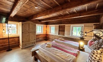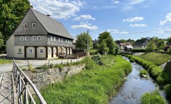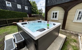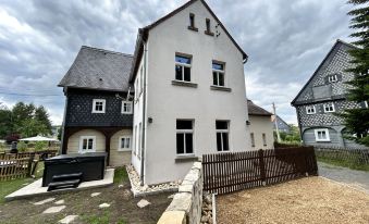 Historical 2-family house, 2 storeys, built in 1790, renovated in 2022. 500 m from the centre of Großschönau, 12 km from the centre of Zittau, 30 km from the centre of Löbau, 20 m from the river. For shared use: natural state property (fenced). Private: hot tub. Bread roll service. Shop 500 m, supermarket 200 m, restaurant 400 m, bakery 300 m, bus stop "Großschönau Weinhaus" 700 m, railway station "Großschönau Bahnhof" 1.5 km, outdoor swimming pool 1.5 km, bathing lake "Olbersdorfer See" 13 km. Walking paths from the house 5 m, ski lift 4 km, ski school 4 km, cross country ski track 4 km. Well-known ski regions can easily be reached: Waltersdorf 4 km. Well-known lakes can easily be reached: Olbersdorfer See 13 km. Please note: Additional accommodations can be booked. "Hexe", 6-room house 237 m2 on 2 levels, on the ground floor. Rustic and antique furnishings: living room, ceiling height 185 cm with Scandinavian wood stove and satellite TV (flat screen), DVD and DVD collection available. 1 room, ceiling height 185 cm with 1 double bed (180 cm, length 200 cm), satellite TV (flat screen). 1 room, ceiling height 185 cm with 1 bed (90 cm, length 200 cm), 1 double bed (180 cm, length 200 cm), satellite TV (flat screen). Kitchen (oven, dishwasher, 4 induction hot plates, toaster, kettle, microwave, electric coffee machine) with ceiling height 240 cm, Low door height 170 cm, dining table. Bath/WC, shower/WC, Sauna. Gas heating, underfloor heating. Upper floor: (steep stair) living/sleeping room, Low door height 180 cm ceiling height 190 cm with 1 double sofabed (140 cm, length 200 cm), Scandinavian wood stove, dining table and satellite TV (flat screen), DVD and DVD collection available. 1 room, Low door height 170 cm ceiling height 190 cm with 1 double bed (180 cm, length 200 cm), satellite TV (flat screen), DVD. 1 room, Low door height 180 cm ceiling height 190 cm with 1 bed (90 cm, length 200 cm), 1 double bed (180 cm, length 200 cm). Kitchen (oven, dishwasher, 4 ceramic glass hob hotplates, toaster, kettle, microwave, electric coffee machine) with ceiling height 240 cm, Low door height 175 cm, dining table. Shower/WC, sep. WC, Sauna. Gas heating, Electric fireplace. Patio, lawn 500 m2. Terrace furniture, barbecue (portable), deck chairs. Facilities: washing machine, dryer, safe, iron, hair dryer. Internet (WiFi, free). Parking (4 cars). Please note: non-smoking house. Maximum 3 pets/ dogs allowed. Smoke alarm. Desk with computer and printer. Infrared sauna and Finnish sauna. Outdoor hot tub.
