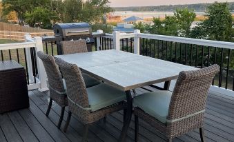 The new deck offers a grill, outdoor dining set, and cozy gas fire pit for relaxing over a glass of wine.