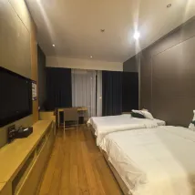 Отель расположен в пешей доступности от выставочного комплекса, рядом метро Пажоу. Заселение прошло быстро, номера оснащены стирально-сушильной машиной, мини холодильником, индукционной плитой и микроволновой печью, однако посуды в номере нет. По умолчанию в номере нет утюга и гладильной доски, следует это учитывать. Кондиционер работал отлично. В номере имеется индивидуальный бойлер для горячей воды, температуру можно регулировать самостоятельно. Мебель и стены имеют дефекты. В номере хотелось бы иметь больше освещения.
