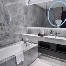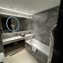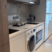 Very nice hotel and comfortable. Rooms are stylish and equipped with all you need. Dishes, tea maker , coffee machine, fridge, microwave and laundry machine. WiFi is great. Service was solid and amenities are good. Nice weight room to workout and has sauna and steam which you can book by appointment.