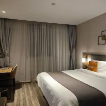 位置不算太好但離天河CBD維多利廣場很近,走路10分鐘就到了,主打性價比,鬧中取靜,服務也還好,有機器人送餐房間。大堂吧枱有設計感比較用心。因為孩子維多利雅思集訓連續住了19天,總體還是滿足需求!但不要期望太高畢竟是經濟型酒店,房間滿足一般性需求,面對小區比較安靜。