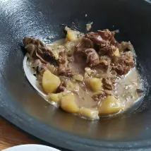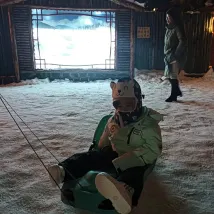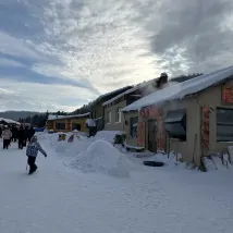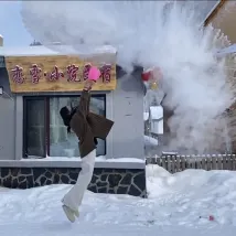在雪鄉院裏,屋裡很暖和,出門過一個小橋就是雪韻大街,旁邊是滑雪場,特別方便,小橋那邊可以玩滑雪板,老闆老闆娘人都很好,鐵鍋燉大鵝特別香,有花棉襖可以拍照,還有小童用的滑雪板,都是老闆老闆娘免費提供的,再去雪鄉玩我還會住他家。