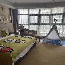 理入住時前台小芳全程微笑服務,非常的專業,房間的東西都是新的很齊全,叫外賣會有機器人給送到房間!看見有孩子還幫忙協調了個有滑梯的屋