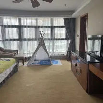 房間很大,是超級飛俠和恐龍元素裝飾,孩子很喜歡,户外有大泳池,室內陽台很大,有浴缸,海景很棒,出門就是沙灘,趕海玩沙很方便,十月份天氣涼了,住着看看海就很好,服務人員態度很好