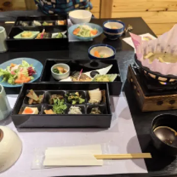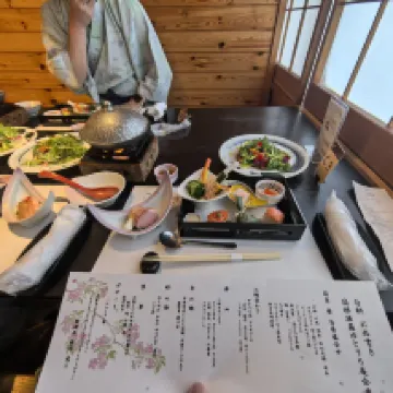 入住傳統日式飯店的體驗非同凡響。房間乾淨溫馨,床鋪清新舒適,還配備了水壺和盥洗用品。晚餐很豐盛(魚類開胃菜、豬肉湯、鮭魚鮪魚沙拉,以及許多其他奇特卻有趣的選擇)。早餐我們不太喜歡,因為我們根本不習慣早上吃湯和魚。我們泡了45分鐘的私人溫泉,花費1650日圓+300日圓稅。我們很享受,但要注意水很燙。大廳提供免費飲用水、咖啡和清酒,二樓提供免費按摩椅。