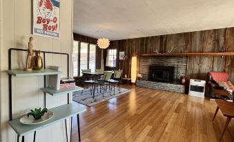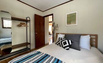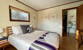 The cottage has two bedrooms (both with Queen size beds), one full bathroom with shower/tub, and a great room consisting of kitchen, dining and living areas. There is a woodstove fireplace in the center of the great room. Hardwood bamboo floors and modern Mid-Century furnishings, and High-Speed Wifi Internet throughout the cottage.