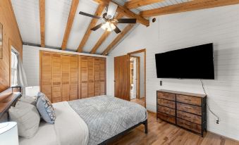 Designed with families in mind, this cabin features plenty of beds and a cozy game area. Upstairs is a room with a Queen bed. Just down the hall is two additional bedrooms. One has 4 twin bunkbeds and a trundle. The other had a double over twin bunk bed. The basement has a bedroom with a King bed. There is also a Queen sofa bed located on the basement level.