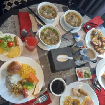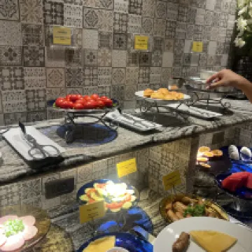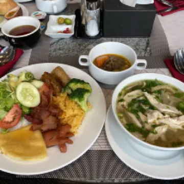 整體房間跟飯店都太陰暗了 黑白配色 燈也不亮 隔音很差 早餐現做牛肉河粉 跟蛋料理 好吃 東西不是很多但都蠻好吃的!