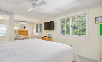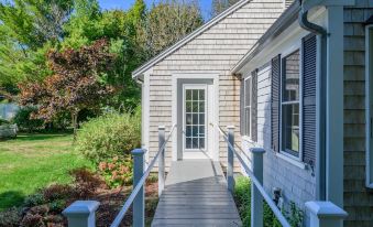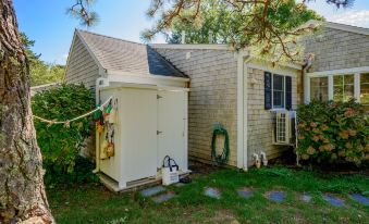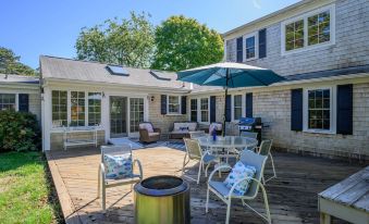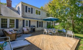 On one side of the kitchen is a sunny nook featuring a farm-style table that seats six. The opposite side of the kitchen is where you find the family room which has a large flat screen TV and plenty of seating for movie nights, game play or watching your favorite team. You can exit this space on both sides as one door leads to access the garage, the driveway and a small deck - perfect for enjoying your morning coffee. The other side of the room has French-style sliding doors that leads to the large back deck with outdoor living and dining spaces that transition to the private enclave of yard space. There is also a gas grill, a fire pit and an outdoor shower which is a Cape Cod tradition!