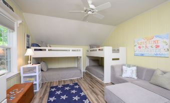 Just past the family room is a half bathroom with full size, front-loading stackable washer and dryer. A few steps beyond that is the first bedroom which features two bunkbeds with two twin beds each (sleeping four). This space also contains a small lounge/gaming couch and its own door to the back yard.