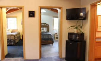 Our two bedroom, one bathroom residence is attached, yet private, with an entrance of its own. It comfortably sleeps four with a queen bed and two twin beds, full bath, living room with a mini-fridge, microwave and other small kitchen appliances to make your stay more enjoyable. The home's original owner and master craftsman took precise care in the building of the entire home - including crafting all of the home's ceilings, support beams and intricacies.