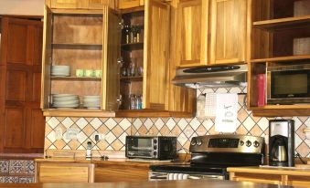 It´s unique tri level design gives the feeling of ultimate privacy in each room for maximum enjoyment. As you enter the front door, walk up the grand stair to the master suite. Inside you will be greeted by 18' beamed ceilings. 1 King size beds welcome you after a long day of activities. Twin french doors on either side of the handmade teak entertainment center open to the private balcony providing a perfect place to sit and relax, read a book or just enjoy the magnificent view.