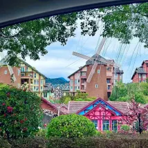 在陽台就能看到湖景,還有風車。樓下有玩的,有美食街,很方便。價格也便宜。感謝曾管家,服務很好,跟管家買温泉票會便宜點