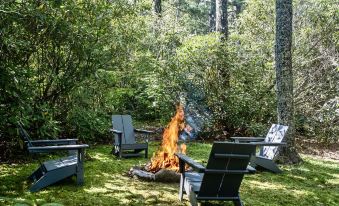 The cottage is nestled within a grove of other quaint cabins in an easily accessible neighborhood in Highlands. Tucked among hemlocks, pines, rhododendrons and oaks, a private yard features a fire pit with four adirondack chairs. The screened-in porch off the back of the house also offers the opportunity to breathe in fresh mountain air. The side patio offers al-fresco dining and a grill.