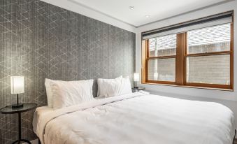 Two bedrooms, conveniently located on the lower level, feature king-sized beds, one that can be converted into two twin beds. Styled in simple, modern decor with plush bedding and twin nightstands, both bedrooms feature a picture window and wall-mounted TV. Black-out and sheer window coverings throughout allow for maximum privacy.