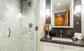 Guests share a newly remodeled bathroom with a step-in shower on the lower level, with a separate powder room on the main level for convenience. A private washer and dryer, complete with complimentary laundry pods, keeps ski clothes warm and bathing suits dry for new adventures no matter how long your stay.