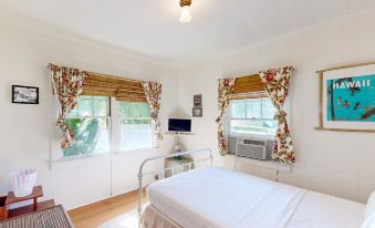 The cottages feature gleaming hardwood floors, vintage-inspired Hawaiian décor, and pops of tropical color. Both cottages have living areas with plenty of seating, and one has a flat-screen TV.