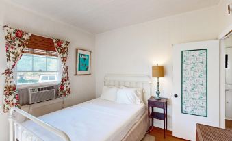 Together, the two cottages sleep eight guests total. Both cottages have the same configuration, with a queen bed and flat-screen TV in the first bedroom, and two twins in the second bedroom. All beds feature lovely wrought-iron frames and hotel-quality linens, and each bedroom has an A/C unit. The bathrooms feature a tub/shower combination and subway tiles.