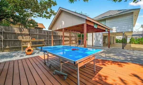 The outdoor area is covered and decorated with hanging lights, making it suitable for any weather. It features patio furniture, a picnic bench, and a ping pong table.
