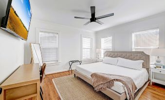 The bedrooms are equipped with king-sized beds, TVs, and connected to a 3-piece bathroom with newly remodeled vanities and subway tiles.