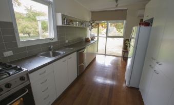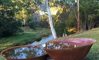 The house has 2 bedrooms and sleeps 4 in luxury. There is one queen room and 2 singles in the second bedroom. Superb linen and top quality comfortable beds. There is a modern kitchen and Satellite TV. New furnishings throughout, and a well equipped full size kitchen. There is a wood burning fireplace and reverse cycle airconditioning and heating. There is also a glorious swimming hole at your front door and a fabulous verandah made for just sitting.