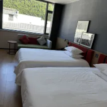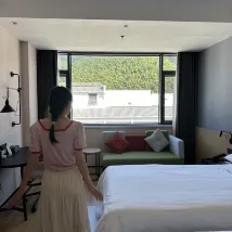 衞生:乾淨 環境:一起來能看見藍天白雲,一座青山,感覺太棒了。很安靜。 服務:前台工作人員很負責,房間洗漱用品幾時添加。 設施:很好 唯一一個不好就是房間門太重了,關門時好大聲。