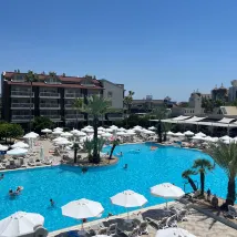 Отдыхали седьмой раз в отеле, приезжаем каждый год, как на дачу. Всех знаешь, все знакомо. Отель очень нравится, особенно, что аппартаменты состоят из 2 - х комнат. Хочется отметить чистоту в номерах благодаря заботливому персоналу. Отмечаем горничную Мерал. Пляж, бар в пешей доступности у моря. Лежаков всегда хватает. Персонал очень приветливый. Детская анимация на уровне благодаря аниматору Нелли, которая каждый год вносит, что-то новое. Девочки на рецепшене всегда готовы прийти на помощь. Шесть лет из семи нас встречает Анастасия. Кухня вкусная-европейский стол с элементами турецкой кухни. После отдыха остались всем очень довольны. Всем спасибо.