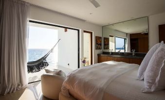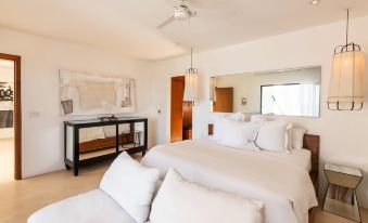 Zyanya is a unique one of a kind oceanfront property located on Punta Sur. The home contains four large master bedrooms each with their own private master baths all with views to the ocean. The downstairs bedroom which is also wheelchair accessible is not only facing the ocean but open to poolside for easy access. Each of the three upstairs bedrooms has a private balcony with the most incredible ocean views. There is one central tub room upstairs with a large oversized bathtub for the whole house to enjoy and escape after a long day at the beach, pool or exploring the island. The large oversized double living room and kitchen with ceiling to floor sliding doors open to the outside allowing for ocean breezes to fill the house. Large Oceanside infinity pool and deck equipped with lounge beds, dining area, and chairs are perfect for entertaining.