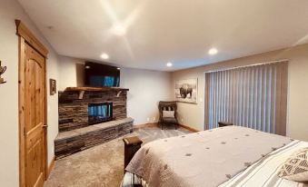A half flight down from the kitchen is a shared bathroom and a beautiful bedroom that features a private fireplace, TV, sitting area and a king bed. Also on this floor you’ll find the garage access and the laundry room.