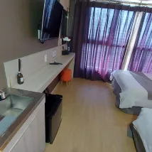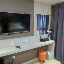 衛浴沒有乾濕分離、冷氣風量難調整、冷氣位置會讓靠牆的較熱但靠窗的很冷、由於入住時已超過櫃檯服務時間(pm10)所以房卡是放在櫃檯依房號讓房客自取,雖然方便但可能有安全疑慮。乾淨,大廳有販賣餅乾飲料和泡麵。