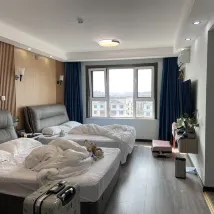 公寓型酒店。房間比較寬敞,設施還不錯,衞生條件一般偏上,周圍晚上小吃什麼的也都有。距離青島機場很近,老闆提供接送機服務。老闆態度很不錯。