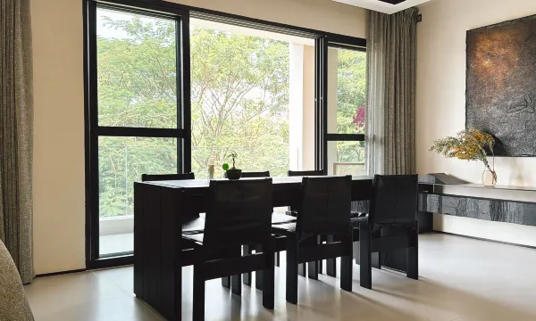“少即是多”,室內裝飾儘可能少保留建築結構,選用質樸有天然肌理的材料。我們在自然跟功能之間糾結,應用很多黑色傢俱“碳化木”,我們沿用傳統的非遺工藝榫卯結構解決結構連接,運用華麗的黃銅鋦釘來修補斑駁開裂的木縫,使其變成“無彩斑駁的黑”低調又華麗,神祕又自然。榫卯與鋦釘保留了木匠與木材之間的較真。藝術品的陳設以“留白”為主,居中而不對稱,對齊且不對中,追求平衡和諧的美,“事無鉅細,物無完美”。