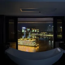 房間是洞穴風格的,很漂亮,房間也很大,設施齊全,有中央空調 感應吹風機 智能語音助手及馬桶,很方便,裏面還有浴缸,還準備了一次性泡澡帶,非常貼心,在房間就能欣賞瀾滄江的風景,前台服務也很好