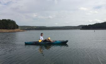 When you are ready for a change of pace, we invite you, your friends, and your family to enjoy what we have found to be Texas Paradise. Please join us at our newly updated villa located in The Hilltop section of The Hollows of North Shore. Here, you will make new family memories in our 3 bedroom, 3 bathroom condo offering all of the comforts and conveniences of home, along with panoramic views of Lake Travis and the Texas Hill Country. Up to 8 people can comfortably sleep and dine in our villa. The master bedroom has a Temperpedic mattress king bed, night tables with lamps, and en-suite grand bathroom plus patio access. Bring your bubble bath for the jetted tub. The master bathroom has a walk-in shower, large closet, and a double sink vanity area. The second bedroom has a queen bed with small chest. The small chest has a Smart TV. This room has its own en-suite bathroom. The third bedroom is the bunk room with two sets of bunk beds and a small table with Smart TV. The bunk beds can be moved together to form one bed. Bathroom is next to this bedroom. Please let the sunrise greet you with your cup of coffee made in a Keurig coffee pot or regular brewer. Relax when seated on your comfortable patio lounging furniture, sipping your favorite beverage and listening to the birds sing. Prepare your meals while gazing at the lake from the well equipped kitchen. Please dine inside or al fresco on the spacious patio. Experience restful sleep on firm mattresses with luxury linens. The Living Room has a 65 inch Smart TV so that you can stream your favorite programs from your apps. WiFi is available free and an office area if you must do a few work chores while on vacation. The family room has a brown leather sectional and ottoman plus a recliner for everyone's comfort when kicking their heals up to unwind. Children board games, high chair, and pack n play are provided. There is a small selection of family movies. A full size washer and dryer are in the home for your convenience. After enjoying your home away from home, please take in all the beauty and fun amenities that The Hollows has to offer. It is a paradise deep in the heart of the Texas Hill Country. Find a trail or two to explore the limestone canyons, the pristine wilderness, and wildlife. At dusk, keep your eyes open for deer and road runners. Around the corner and up the hill from your villa, you will be at the highest point of The Hollows, The Smokehouse. Up here, you will find breathtaking vista views of the area. There is a fire pit for roasting marshmallows, a gas grill for grilling, and a pavilion for your family reunion or party. Around the corner and down the hill, you will find the boardwalk that will take you to The Beach Club and marina. At The Beach Club, you will find a locker room, workout room, bar, restaurant, gas grills, pavilion, infinity edge swimming pool with bubbler/ beach entry area for toddlers, grotto hot tubs, and another pool, plus a green field for sporting games, and a pickle ball court. At the marina, you can rent a space for your own watercraft. We use Just For Fun or VIP Marina to rent any type of watercraft that we want when it is time to play on the lake. Our Hilltop Villa is the perfect way to experience all that the Texas Hill Country and Lake Travis area has to offer. You can be as active as you want or you can relax and take in the incredible views. We look forward to sharing with you, your family, and your friends our home away from home. Please feel free to book your vacation or to get more information. Please reference our VRBO listing number 581778 when you contact us. I now have couple of contacts that are captains of their own ski or pontoon boat. They will give you a tour of the lake, provide a tube, wake board, wakesurf board, and a cooler with ice for you to fill with yummy drinks and snacks. Plus he has a pad to put out in the water to float on. If interested in any of these fun activities, please make your reservation and lets book your great holiday! The boat ramp, at The Hollows, is closed until the lake level is higher.