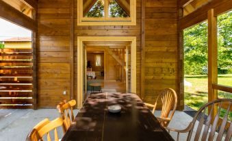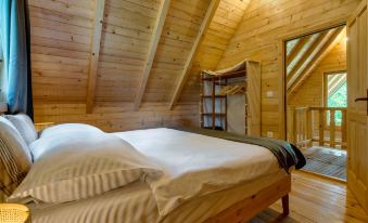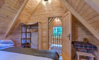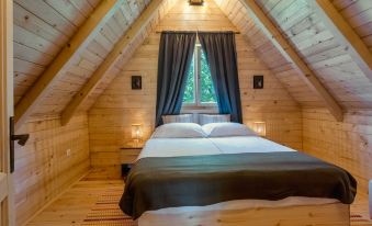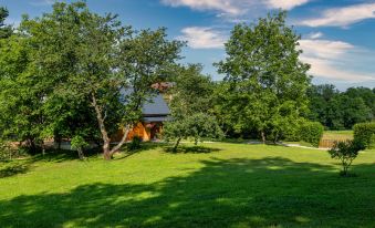 Cosy chalet "Jela", 2 storeys, built in 2024. 3 km from the centre of Karlovac, in a sunny position, 108 km from the sea, 1 km from the river, in the countryside. Private: property 5'000 m2 (fenced) with lawn and trees, orchard. Terrace (16 m2), garden furniture, barbecue. In the house: internet access. Parking (for 2 cars) at the house on the premises. Shop 2 km, supermarket 3 km, restaurant 2 km, bus stop 5 km, railway station 5 km. Tennis 5 km, walking paths from the house 1 km. Well-known lakes can easily be reached: Plitvička jezera 87 km. The owner does not accept any youth groups. Please note: the owner lives on the same property. Organizing a party is not allowed. . 2-room chalet 48 m2 on 2 levels. Wooden furniture furnishings: living/dining room with 1 double sofabed (160 cm, length 200 cm), cable TV (flat screen), electric heater and air conditioning. Exit to the terrace. Open kitchen (oven, dishwasher, 2 induction hot plates, toaster, kettle, freezer). Shower/WC. Top floor: 1 room with sloping ceilings, ceiling height 100 - 300 cm with 1 french bed (180 cm, length 200 cm). Electric heating, forced-air heating. Deck chairs (2). Facilities: Internet (WiFi, free). Maximum 1 small pet/ dog allowed.