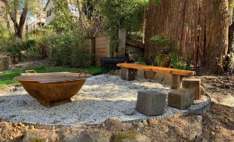 Set in beautiful grounds, the flat has views from the terraced garden into the bush, and has its own entrance off a paved flower garden. It also has a rear entrance onto a private courtyard with a small deck and seating.